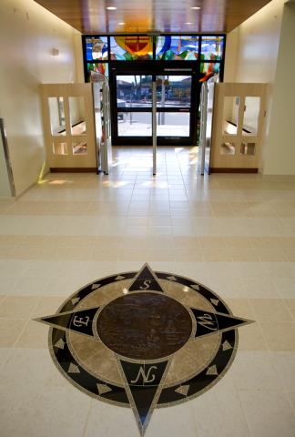 Artist Geri Jimenez Gould, a former Crescenta Valley resident now residing in Fallbrook, CA, designed and sculpted a bronze floor medallion for the first-floor atrium. The medallion, commissioned by the Friends of La Crescenta Library, features key historical figures of the region. These figures include Don Jose Verdugo, a Spanish soldier and bodyguard to Friar Junipero Serra, who was granted the first Spanish Land Grant in the area and was assigned to the Mission San Gabriel Arcángel; Toypurina, a young Gabrielino/Tongva Warrior Chief who led the revolt against the Spaniards in 1785; and Dr. Benjamin Briggs, a physician who coined the name La Crescenta Valley, after the three crescent shaped peaks he saw out his window. Gould worked closely with the local historical society to accurately depict La Crescenta's rich history.