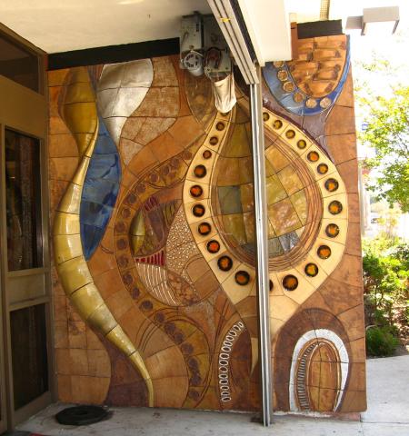 Frank Matranga’s artwork is found at the entryway to the library. Composed in earth tones in ceramic and glass tile, the piece features vertical curvilinear forms. The bulbous shapes are meant to evoke expressions of the sea and sea creatures like clams, mussels, and jellyfish.
